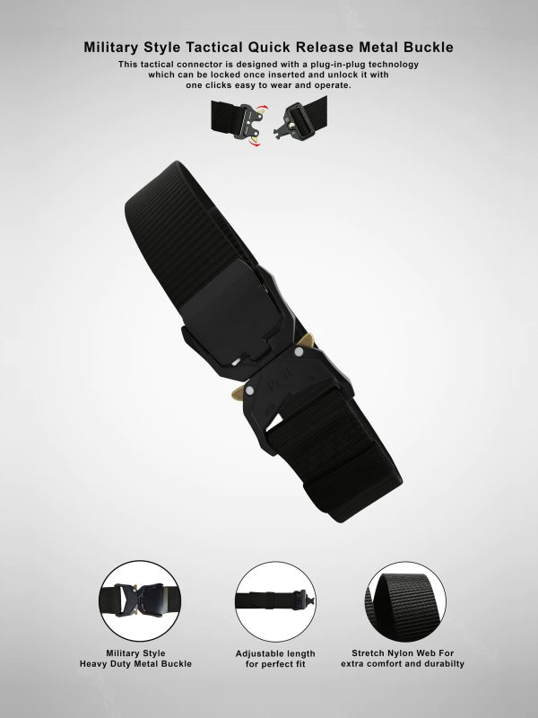 The "DALE 1-D555 Black Tactical Stretch Webbing Belt With Heavy Duty Quick Release Buckle" is a men's belt designed and made by the Duke Clothing Co under the D555 brand.