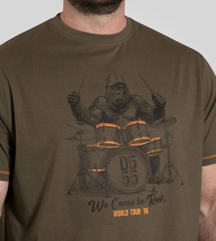 Stand out in style with the D555 STOCKTON Gorilla Playing Drums T-Shirt – perfect for music fans and trendsetters!