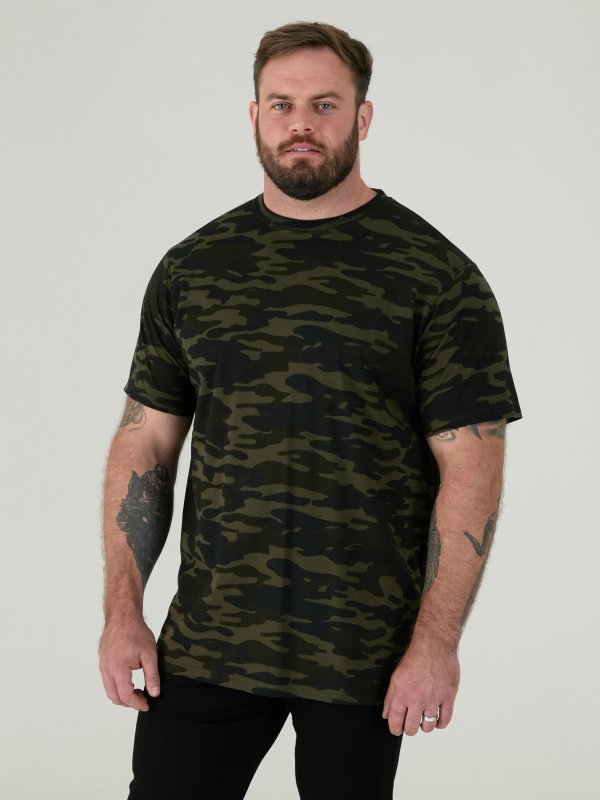 The Duke Clothing Co "GASTON-D555 Camouflage Print T-Shirt" is a men's t-shirt made by the D555 brand. The t-shirt is designed with a bold and eye-catching camouflage print that is located on the front and back of the shirt. The print is designed to be both stylish and unique, making the t-shirt stand out.