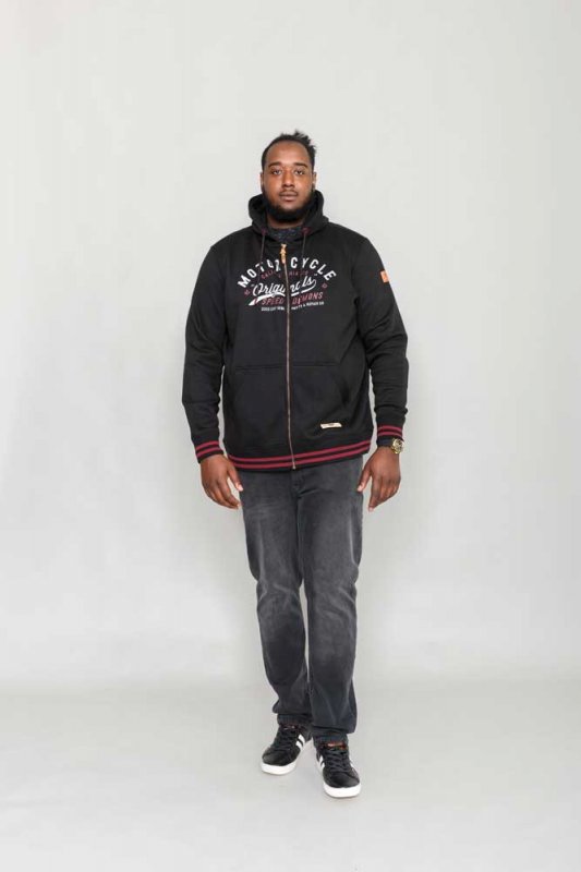The PATRICK-D555 Full Zip Hoody With 'Motorcycle' Chest Print is a stylish and comfortable hooded sweatshirt from The Duke Clothing Co under the D555 brand. The hoody comes in a classic black color and is made from a blend of 50% cotton and 50% polyester, providing both comfort and durability.