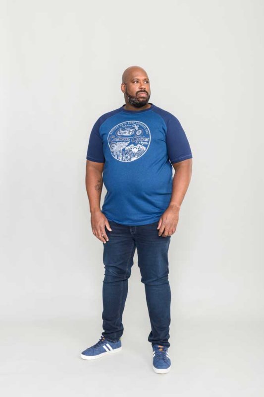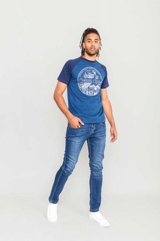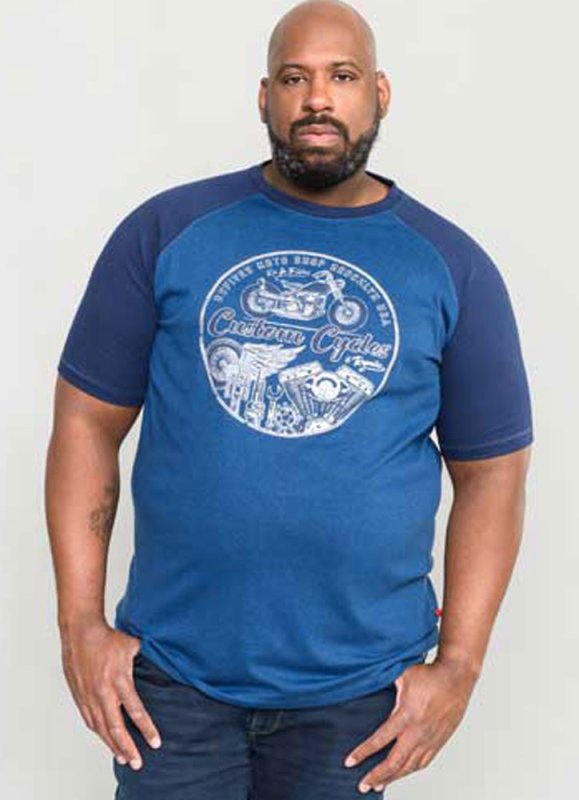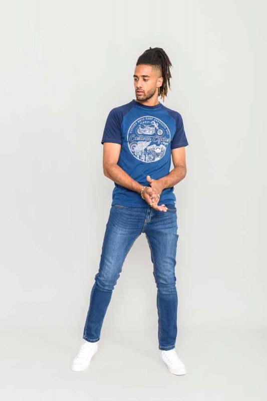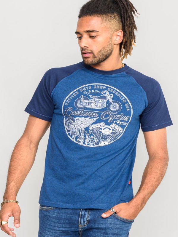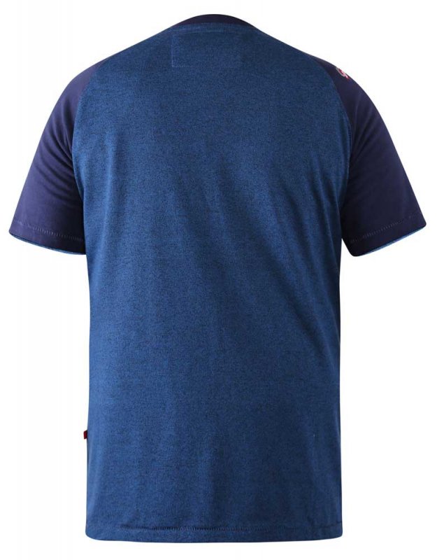 The Duke Clothing Co "PORTER-D555 Custom Motorcycle Raglan Sleeve Printed T-Shirt" is a high-quality t-shirt under the D555 brand. The t-shirt comes in a blue twist color and is made from a blend of 60% cotton and 40% polyester, making it soft, comfortable, and durable.