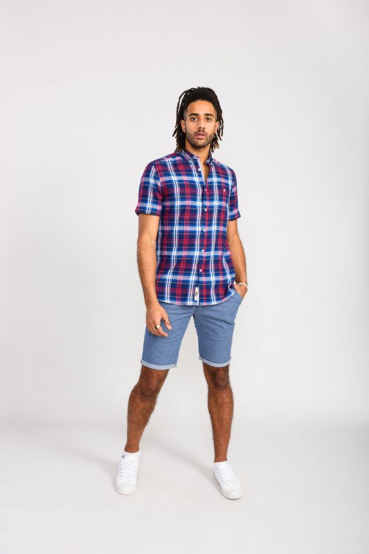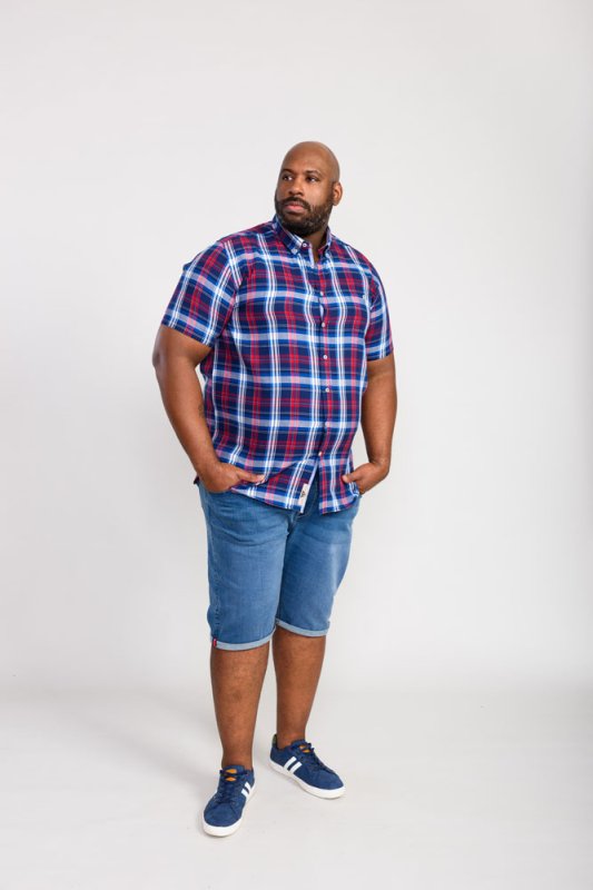 The Duke Clothing Co "PORTLAND-D555 Check Button Down Collar S/S Shirt with Pocket" is a high-quality shirt under the D555 brand. The shirt comes in a blue and red check pattern and is made from 100% cotton, making it soft, comfortable, and breathable.