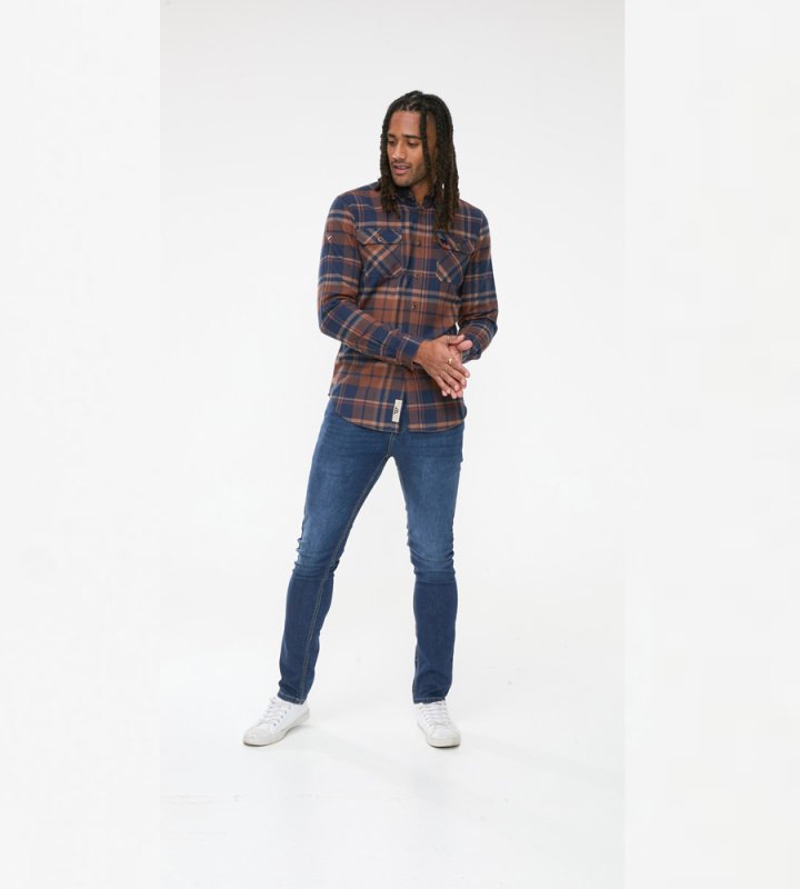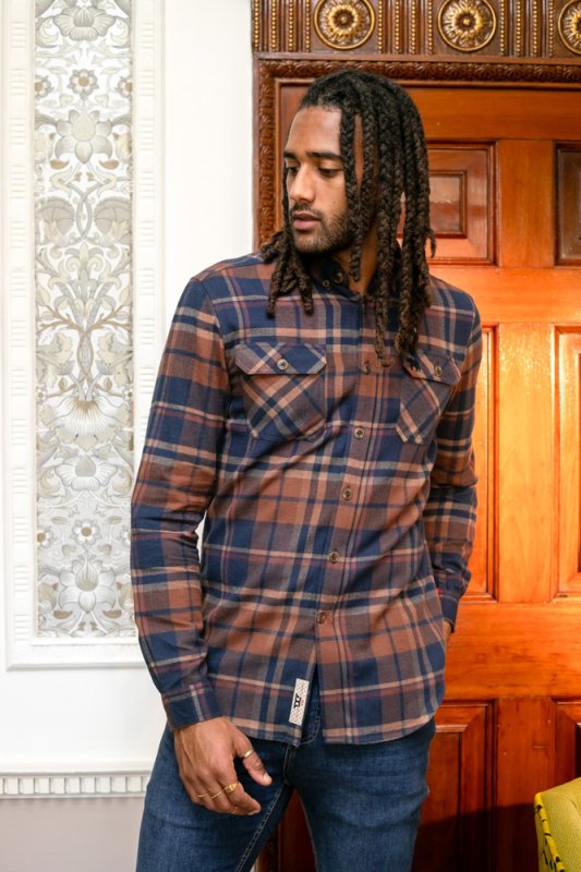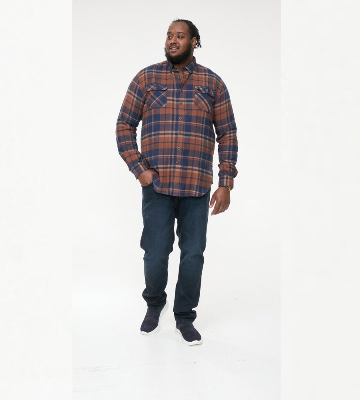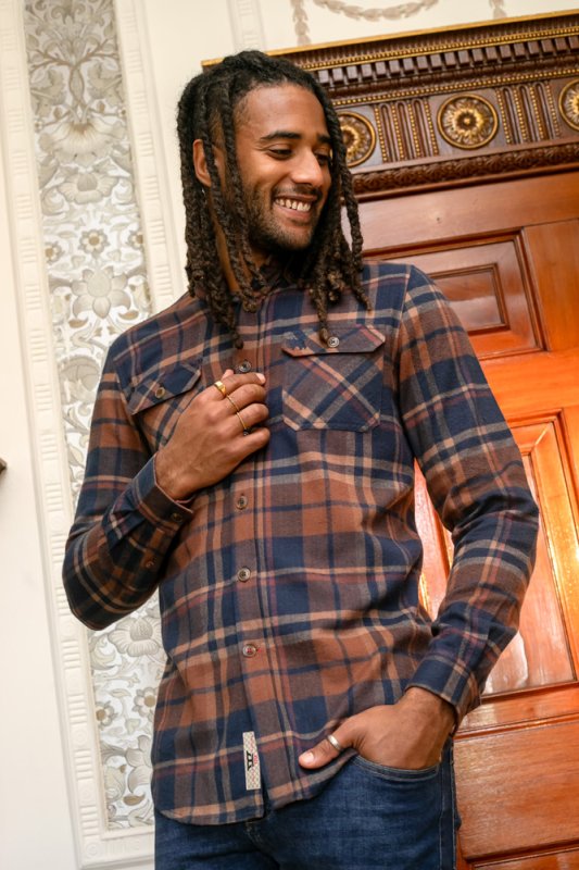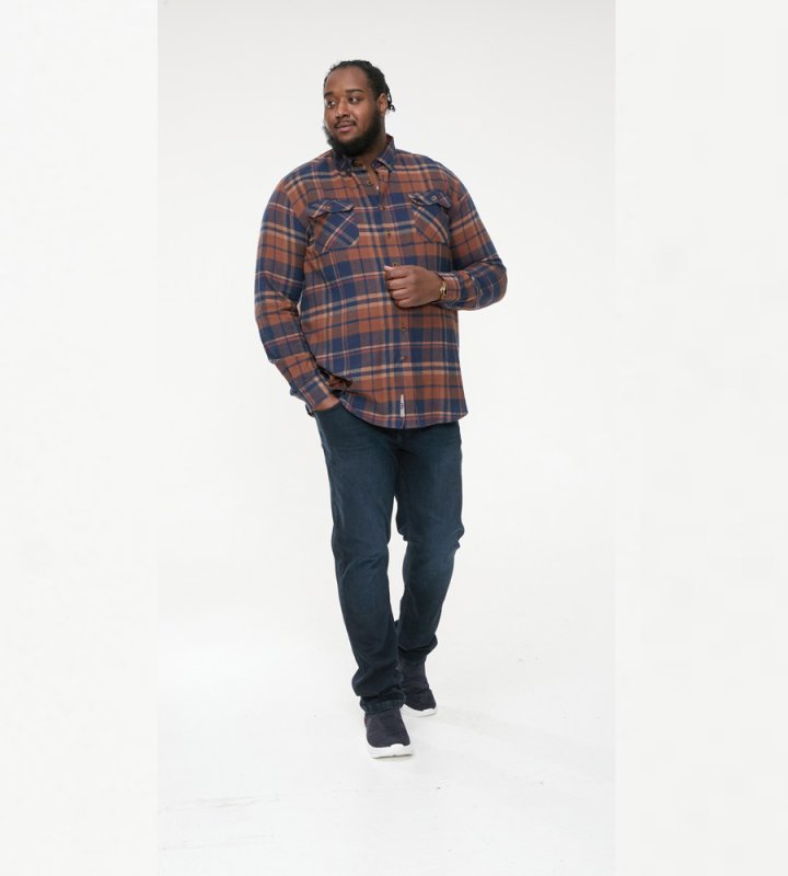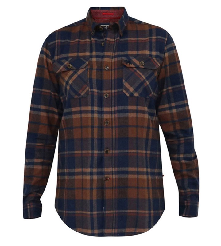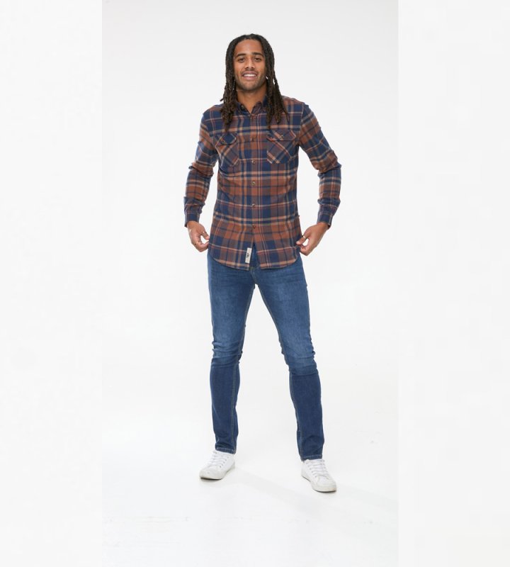The SHERLOCK - D555 Long Sleeve Check Overshirt is a robust and stylish layer that combines functionality and casual looks. Made with 100% pure cotton, this overshirt features a classic navy and tan check pattern and Its two front patch pockets with flaps and a button-down collar offer practicality to style, making it a versatile addition to any outfit.