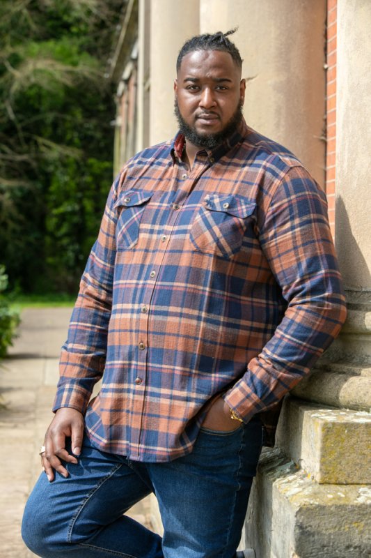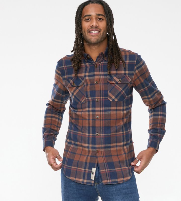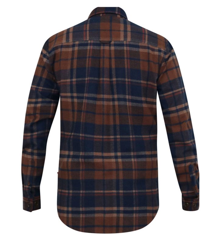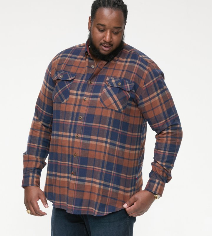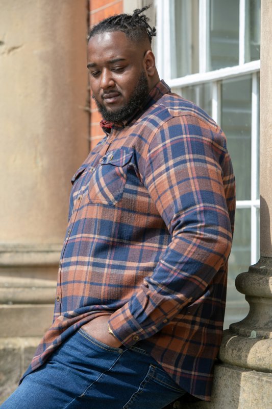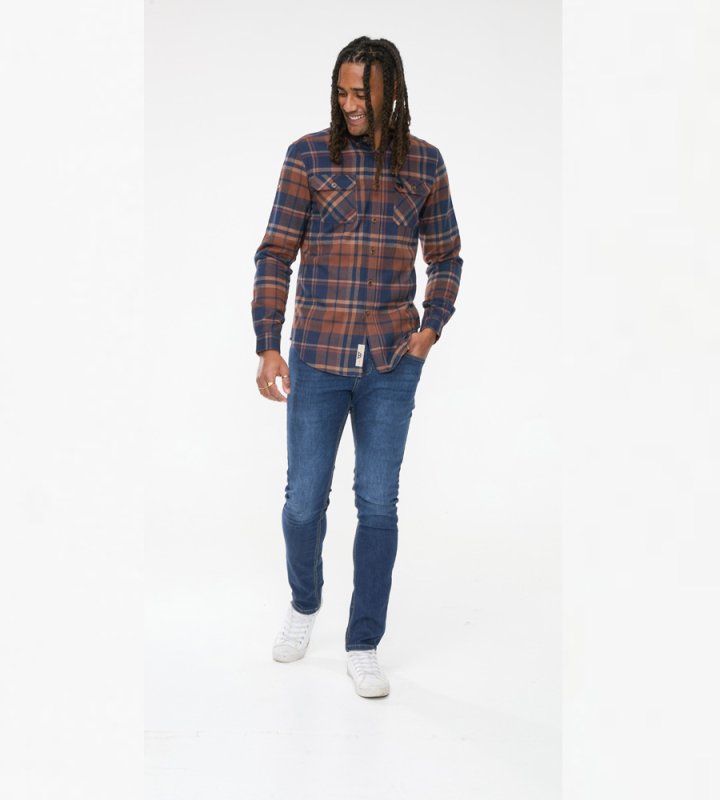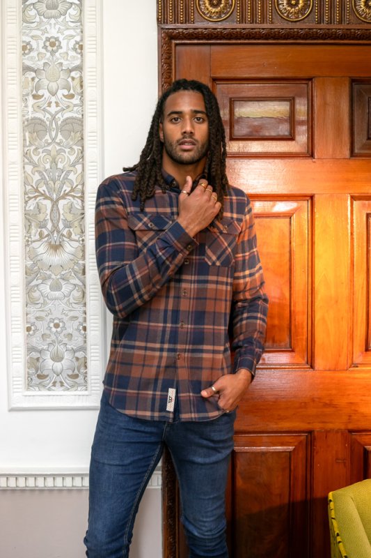 The SHERLOCK - D555 Long Sleeve Check Overshirt is a robust and stylish layer that combines functionality and casual looks. Made with 100% pure cotton, this overshirt features a classic navy and tan check pattern and Its two front patch pockets with flaps and a button-down collar offer practicality to style, making it a versatile addition to any outfit.
