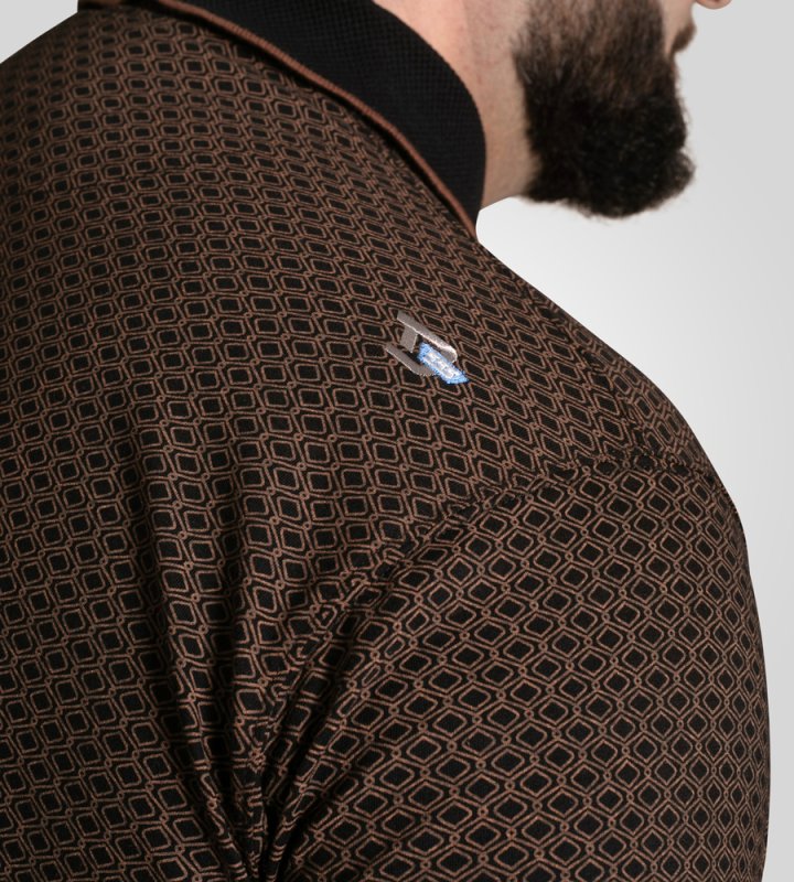 The D555 WORKSOP AOP Polo blends classic polo elegance with modern styling. Made from pure cotton, this premium-quality polo features an all-over pattern (AOP), a stylish jacquard collar, a functional pocket, and gold-tipped cuffs for a refined, sophisticated look. Whether worn casually or dressed up, this black polo with gold detailing is perfect for any occasion.