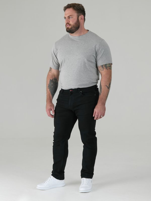 The Duke Clothing Co, under its brand D555, offers a stylish and comfortable pair of jeans called the "CLAUDE-D555 Tapered Fit Stretch Jeans In Black". These jeans are made from a blend of 98% cotton and 2% elastane, making them both durable and flexible.