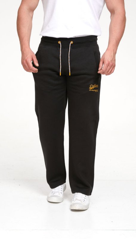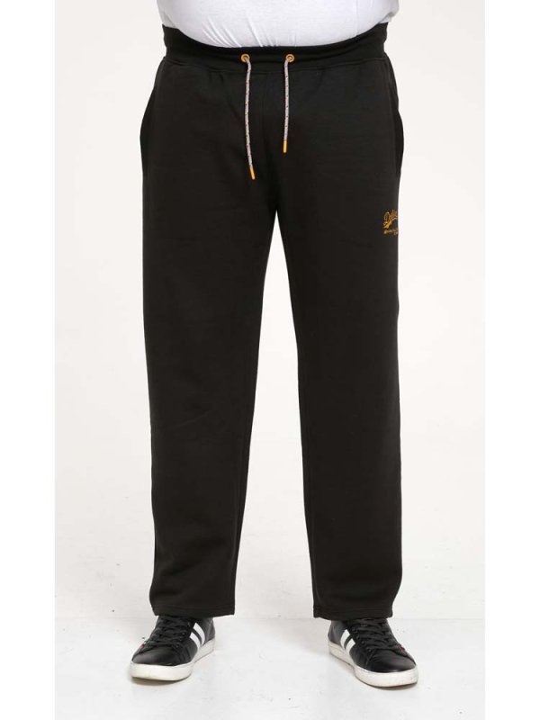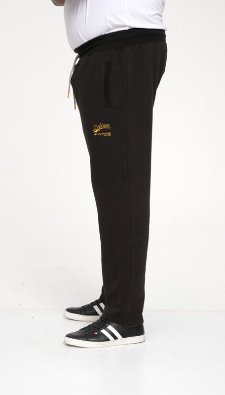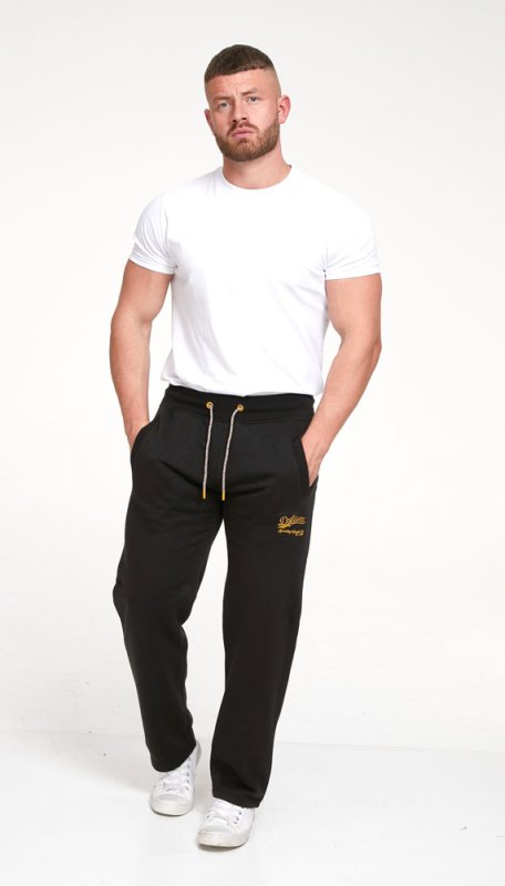 The Duke Clothing Co "GLOUCESTER 1-D555 Open Hem Jogger With Embroidery" is a pair of men's jogger pants made by the D555 brand. The joggers are designed with a classic black color and feature an open hem and embroidery detailing.