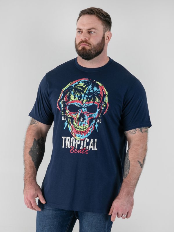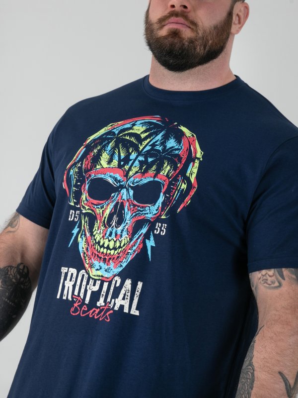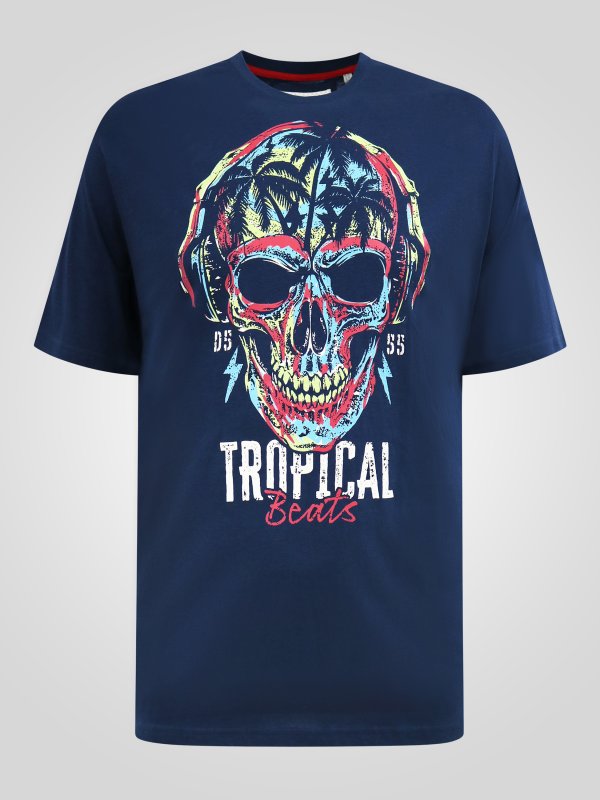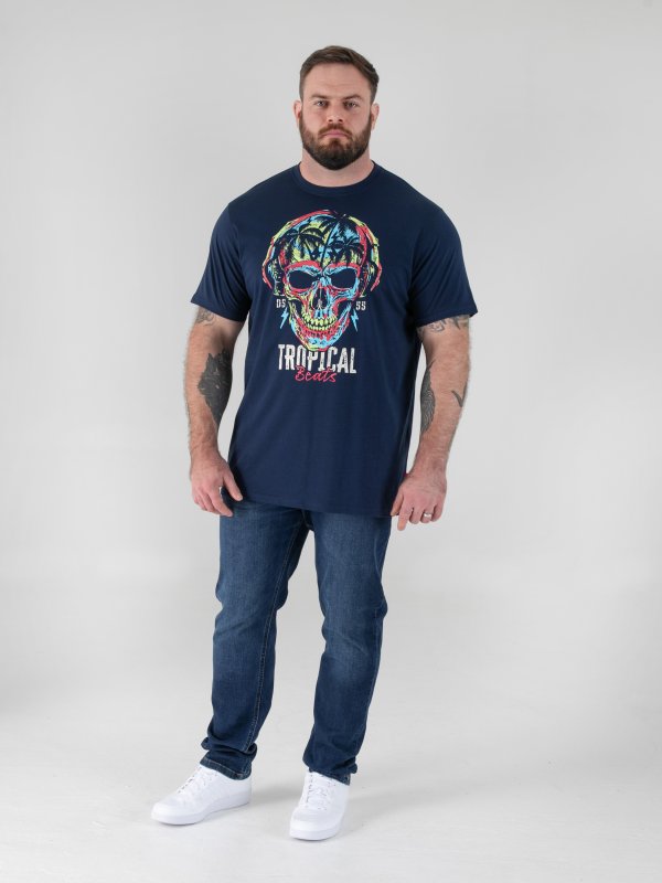Bring bold island attitude to your look with the D555 LINTON Tropical Skull Printed Crew Neck T-Shirt – vibrant, edgy, and built for comfort. Made from premium pure cotton, this tee delivers unbeatable softness and breathability, perfect for relaxed summer days or statement casual wear. The tropical skull print combines cool rebel energy with a holiday vibe, set against a classic navy base for effortless styling. With a crew neck and regular fit, it offers everyday comfort while keeping your look striking and confident.