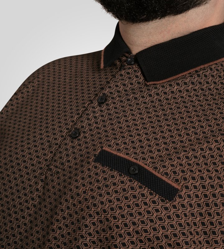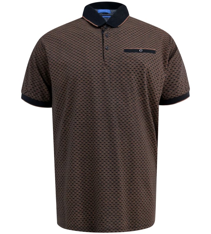 The D555 WORKSOP AOP Polo blends classic polo elegance with modern styling. Made from pure cotton, this premium-quality polo features an all-over pattern (AOP), a stylish jacquard collar, a functional pocket, and gold-tipped cuffs for a refined, sophisticated look. Whether worn casually or dressed up, this black polo with gold detailing is perfect for any occasion.